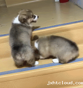 两只柯基宝宝上楼梯,其中一只看同伴上不上去,就立马趴下当垫脚石...